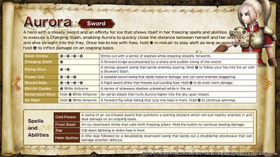 Aurora appears in Dragon Quest Heroes II as a recurring character that can be played as in co-op dungeons, but is unable to be used in the regular story mode. Aurora's moveset is mostly unchanged from the previous game, however Zoom was replaced with Helm Splitter due to the former being repurposed for Wild Zone traversal. Additionally she is unable to equip any weapons or shields, being locked to the Captain's rapier & Aurora's shield, though she can still equip Orbs and accessories. Having save data from the previous title grants Aurora costumes for this game's female protagonists.