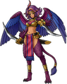 Elegia wears a golden breastplate with a purple cloth underneath around her chest, and a loincloth around her waist with long colorful stripes, a black belt and various gold accessories. She also wears several golden rings on her limbs and tail, as well as a small circlet made of circular gold pieces and necklece decorated with a green bead. Elegia's weapon of choice are a pair of curved daggers, though she excels in Woosh-type magic too.