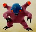 Goobonces are squat pink bipedal demons with bizarre features. Their most notable features are the stalk-like protrusions from their shoulders that each have an extra eye. They have small round blue heads which give them their name, a tiny pair of yellow eyes, and a mouth filled with sharp fangs. On their hands and feet, they have a set of two sharp black claws and talons, which they utilize in vicious slashing attacks. The goobonce almost always appears alongside the bloodbonnet, which has the opposite coloration as them. However, the bestiary description for the goobonce in XI implies that their relationship is unequal.